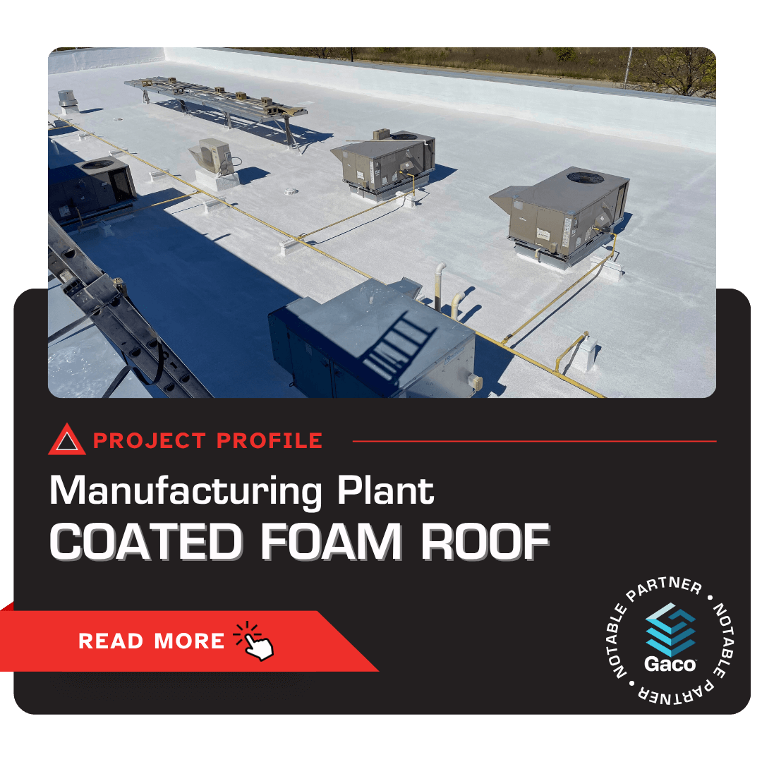 Description: Manufacturing facility foam roof restored with strategic removal and replacement of deteriorated roof foam, and 2 coats of high solids silicone coating across the entire roof surface.
